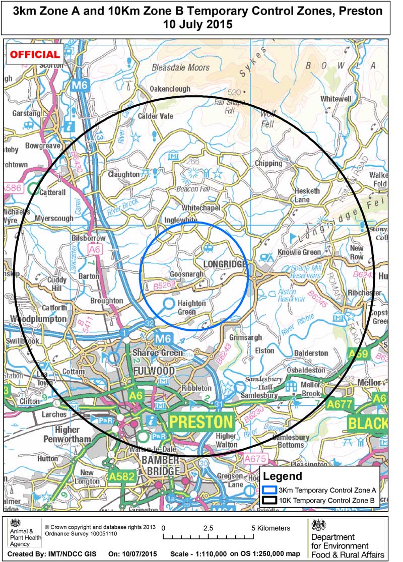 6/ A 10 km restriction zone has been established. Defra are to provide a map shortly of the location of the IP and the extent of the restriction zone;